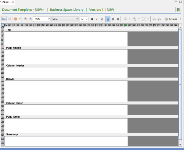 The Report/Presentation Designer is used to create a layout of document templates of the Report type (or simply reports – see Adding/Editing Document Templates) and presentations of business objects and business object groups (see Defining Presentations). When the Report/Presentation designer is started for a new report or presentation the screen looks like this: