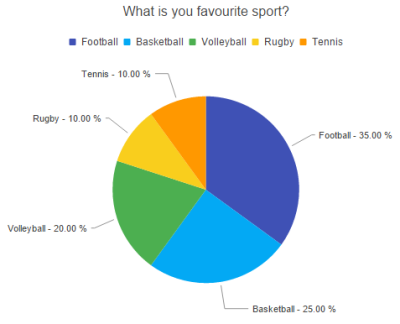 This chart type represents pie charts (shown below). You cannot define series for this chart type, but you can define colors of the pie, as well as properties of the labels: