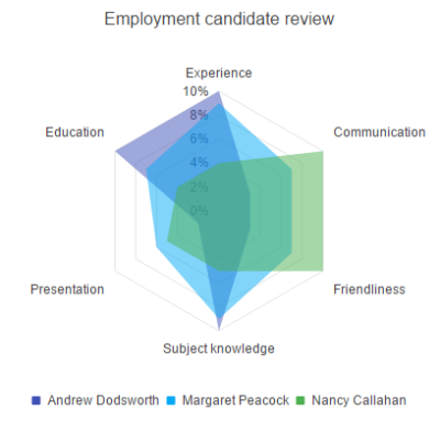The radar chart is shown below. You can define series for this chart type. Each series represents an area on the radar