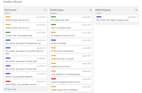 Here a query that retrieves all issues in the system as shown as 3 Kanban columns – open issues, closed issues and deferred issues (Status attribute of the Issue object has the value of Open, Closed and Deferred respectively). The user can move an issue from one column to the other, thus changing its status